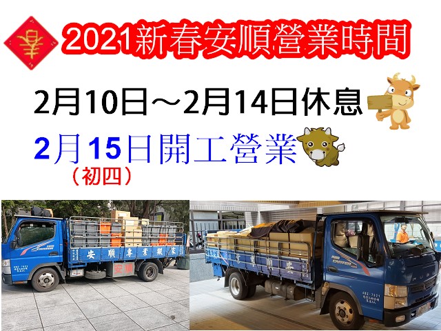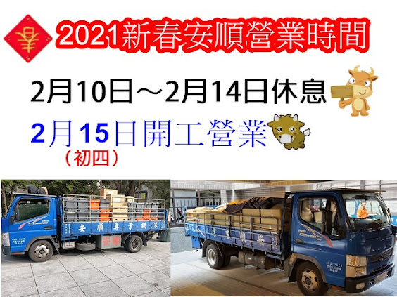 親愛的顧客您好: 安順專業搬家祝福大家新年快樂、諸事如意,安順專業搬家於民國108年農曆過年期間,除夕至初四休假,初五就開始為客戶服務,如有搬運需要,歡迎直接來電與安順吳先生0982-993333及LINE服務洽談,謝謝您 ~